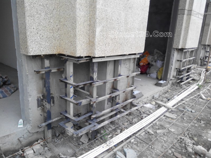 2、安裝固定板材:對(duì)板材進(jìn)行選色對(duì)號(hào),試拼無(wú)誤后待用。同時(shí),將不銹鋼掛件臨時(shí)固定在角碼上,然后在石材相應(yīng)位置開槽鉆孔,清理孔內(nèi)雜物,在孔內(nèi)注膠,安好掛件,然后安裝石材,調(diào)整縫寬及板材的平整與垂直度,檢查符合要求后,擰緊螺栓,