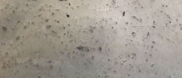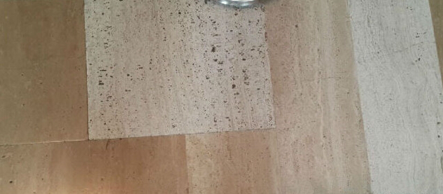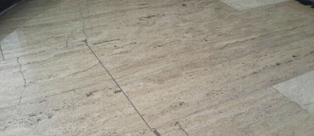 (2)現場問題:該工程所用洞石,在出廠時已補過膠。鋪裝完后研磨翻新,但由于當時施工人員不懂調膠,致使米黃洞石上補的膠發黑,象牙白洞石上補的膠發青。在鋪裝和結晶養護之后,使用了一段時間。由于洞石多孔、疏松、易破損的特性,使得板材的孔洞中大量的藏污納垢,且有破損、劃痕、光澤度下降等問題,大大影響了裝飾效果。