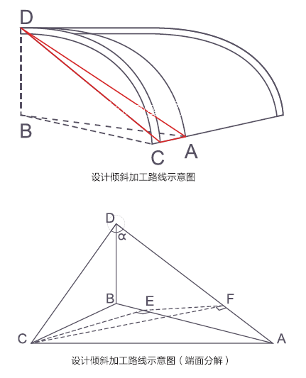 圖中 DB、BC 為弦長;CD 為弧板弦長,AD為斜切后弦長,CA為弧板順高度切除的最大尺寸。可見:∠CDA 就是以弧板底面定位時的工作臺轉角α,∠FCE為扳刀角 β: