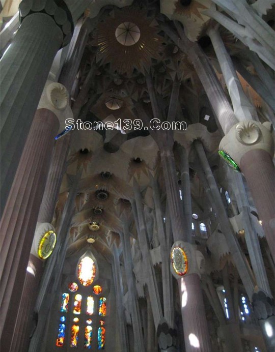 米拉公寓屋頂高低錯(cuò)落,而整棟建筑如波濤洶涌的海面,極富動(dòng)感。屋頂是奇形怪狀突然物做成的煙囪和通風(fēng)管道。米拉公寓里里外外都顯得非常怪異,甚至有些荒誕不經(jīng),該建筑無(wú)一處是直角,這也是高迪作品的最大特色,因?yàn)楦叩险J(rèn)為:“直線屬于人類,而曲線歸于上帝。”