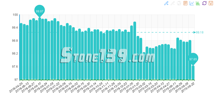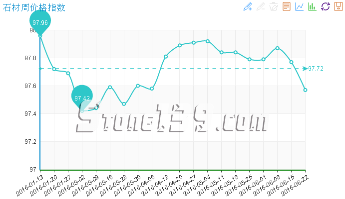 據“中國·水頭石材指數”系統監測,20160622期石材周價格指數收報于97.57點,環比下調約0.20點,下調0.21%。本周石材價格繼續下滑,其中其他石材類價格繼續持平,除合成大理石價格持續攀升外,大理石、花崗石類價格均出現下調,特別是花崗石價格的大幅回落帶動本周石材價格呈現下行的態勢。本周除少數合成大理石大板質量等級高、市場需求增加,價格持續上調外,花崗石荒料及成品價格均隨市場行情下滑而下跌。