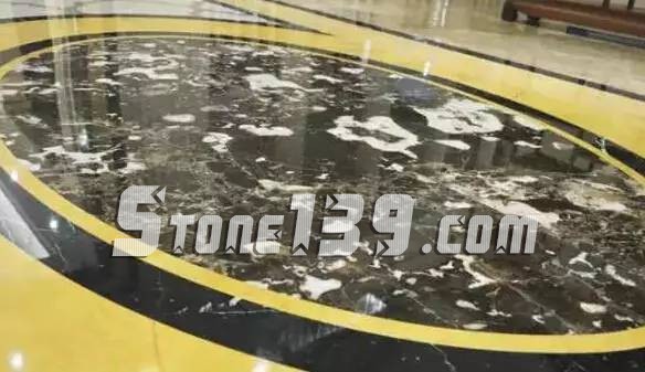 過道以方圓圖形展示,寓意沒有規(guī)矩不成方圓,黑色與金黃色的色系搭配,令空間大氣莊重,環(huán)形圖案內的石材運用,頗具獨到之處,斑斕,深沉,有內蘊乾坤之感。