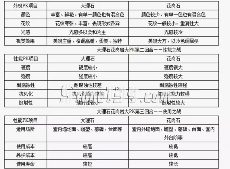 大理石跟花崗巖都是裝修界常用的兩種天然石材,但若要是要辯個孰優孰劣就很難了,畢竟它們各有千秋,我們不妨先從上圖看看他們的優缺點!