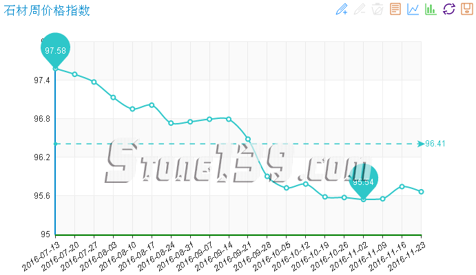 據(jù)“中國·水頭石材指數(shù)”系統(tǒng)監(jiān)測,20161123期石材周價格指數(shù)收報于95.88點,環(huán)比下調0.08點,下調0.09%。本周石材價格波動下調,其中花崗石及其他石材類價格環(huán)比均持平,大理石價格小幅回落,合成大理石類價格則繼續(xù)上調。本周大部分石材品種價格仍較穩(wěn)定,部分大板價格隨市場行情波動調整,少數(shù)大理石庫存舊板有瑕疵,因而降價幅度較大。