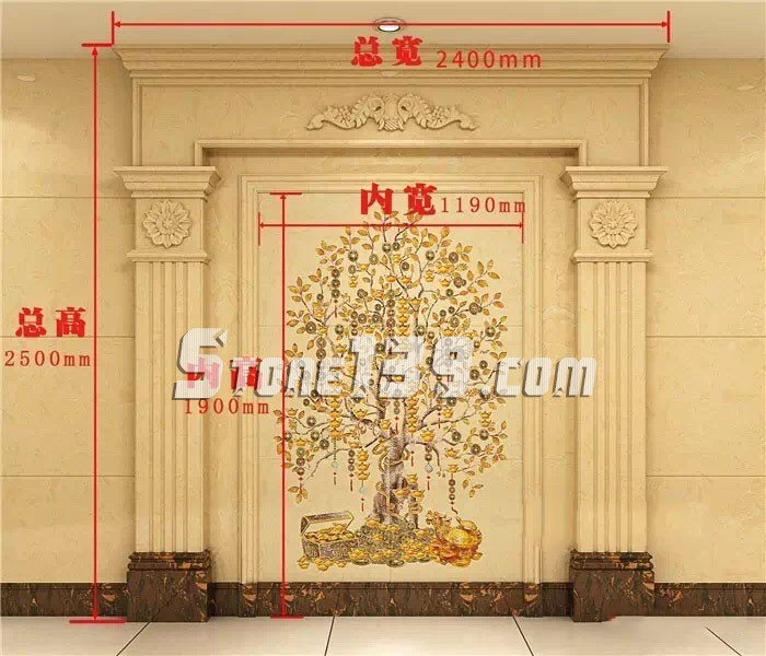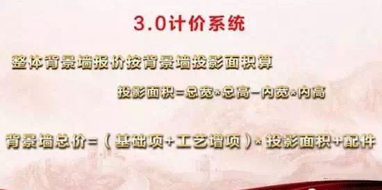 在基礎項當中,整體背景墻的投影面積不足3.5㎡的按照3.5㎡算;帶彎線的門頭板高度按最低點計算;方柱門洞面積按展開面積算,即包括內、外、側三面。工藝增項的雕花件3個以內的算基礎項,從第四個起每個雕花件遞加80元/㎡,以此類推。