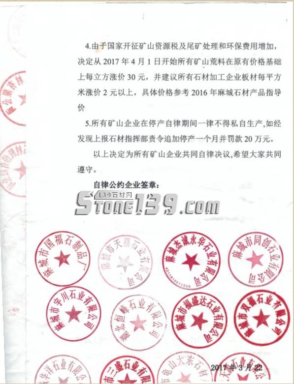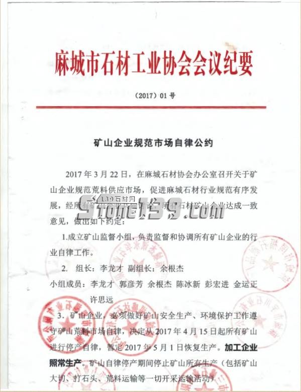 2017年3月25日,麻城市石材工業(yè)協(xié)會(huì)召開2017年首次行業(yè)大會(huì),就推進(jìn)礦山企業(yè)規(guī)范荒料供應(yīng)市場(chǎng),促進(jìn)麻城石材行業(yè)規(guī)范有序發(fā)展,經(jīng)所有礦山企業(yè)共同討論,所有石材礦山企業(yè)達(dá)成一致意見,考慮資源的稀缺性,不再賤賣資源,從2017年4月1日開始采取按需供應(yīng)荒料,從2017年4月15日起所有礦山暫停開采活動(dòng),暫定2017年5月1日恢復(fù)開采,加工企業(yè)照常生產(chǎn)。