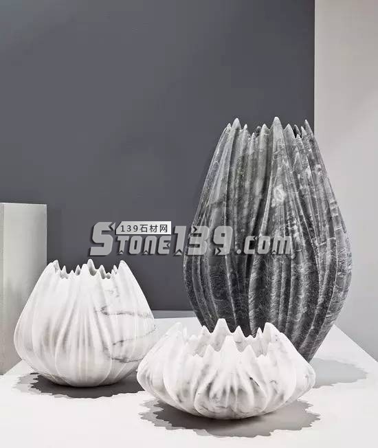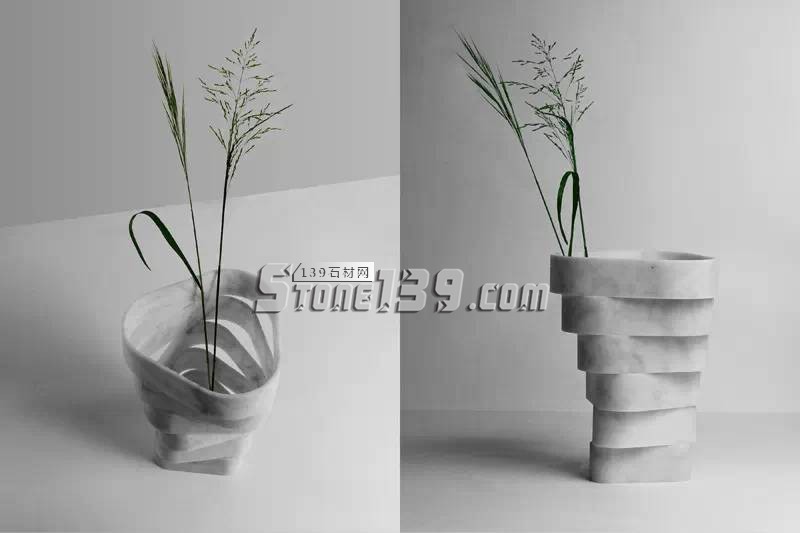 采用同心造型的方法,對大理石進行切割,往上拉伸疊加起來可以形成花瓶。內外表面獨具特色的天然裝飾,花瓶剩下的材料可以當做果盤使用。