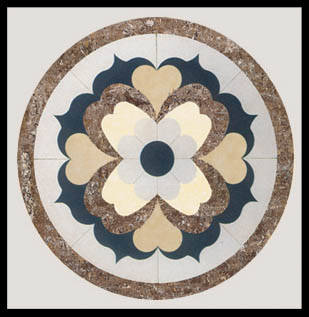 天然石材“率性而為”的紋理走向是大理石拼花過程中最難攻克的難關,即使是最專業的石材師傅也預測不同石材的紋理變化,更何況對石材可能一竅不通的美學設計師。所以,大多數設計師在設計拼花圖案的時候考慮的是石材大方向的紋理,細微之處的紋理變化則全靠在實際切割過程中的靈活應變。一般圓形拼花選擇的都是呈圓周曲線紋理的石材,而方形拼花則是直線或折線狀紋理的石材。