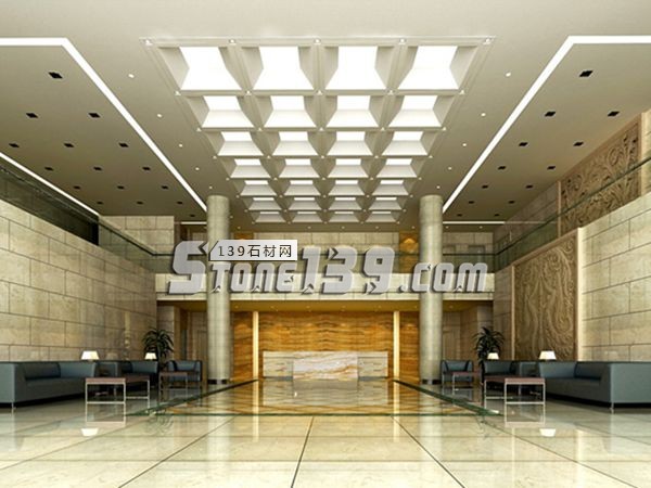 大堂設計,地面和墻面大面積使用侏羅紀米黃,統一的用料更能彰顯出獨一無二的氣勢,讓人感覺開闊、樸素卻不失高貴。