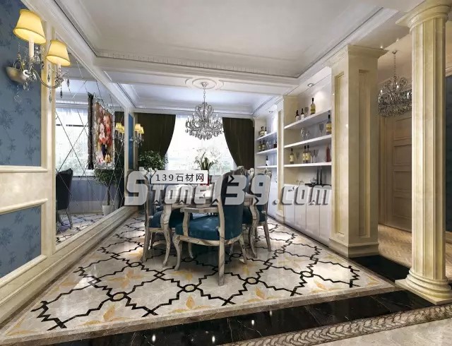 而天然大理石每一片都是大自然造化的結(jié)果。如同世界上沒(méi)有完全相同的兩片葉子,世界上也沒(méi)有完全相同的兩片大理石。所以,天然大理石鋪貼的效果靈活變化、充滿了自然的韻律感和藝術(shù)感。這是瓷磚永遠(yuǎn)無(wú)法超越、到達(dá)的境界。我們能夠一齊來(lái)欣賞比較一下: