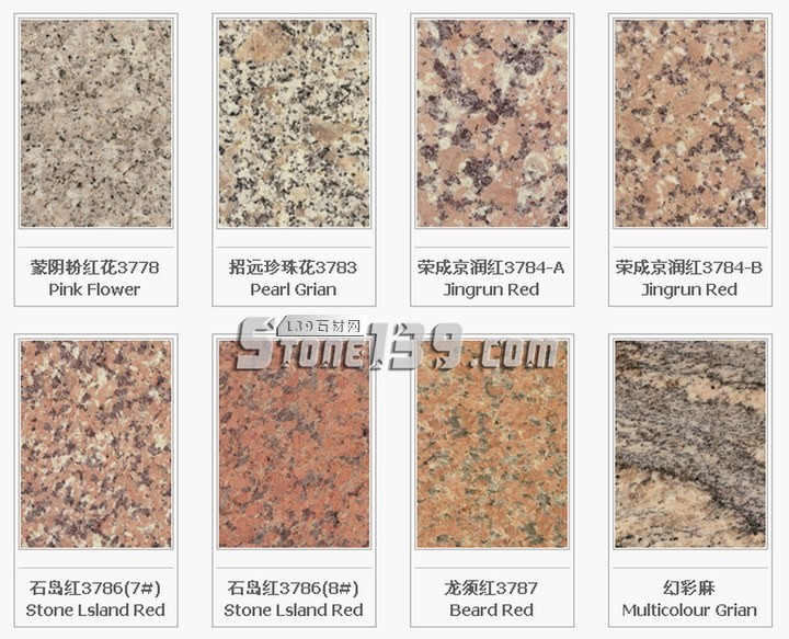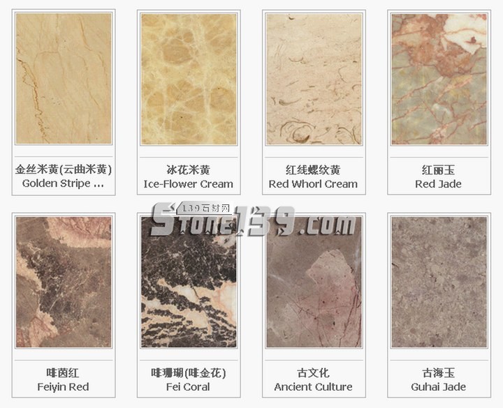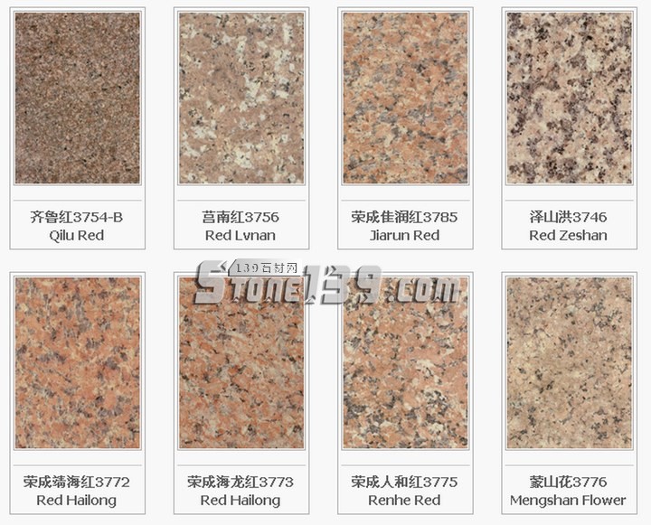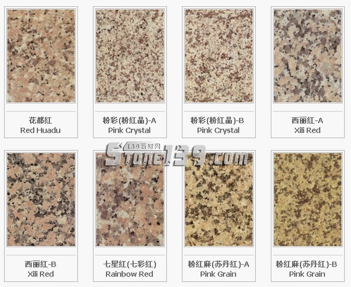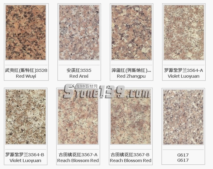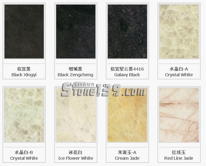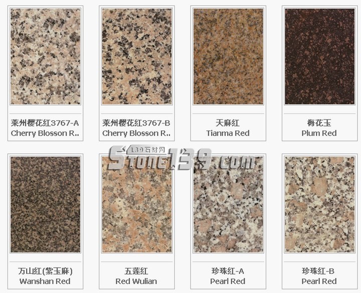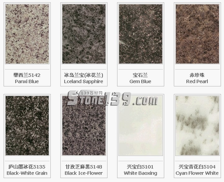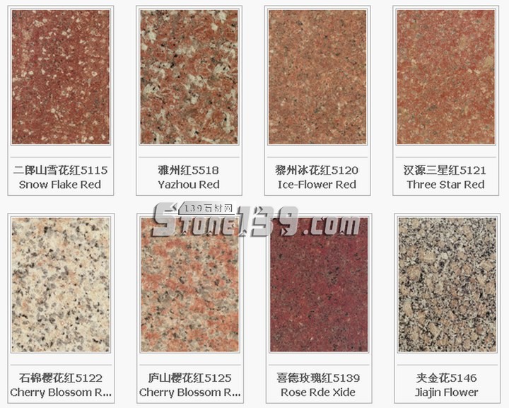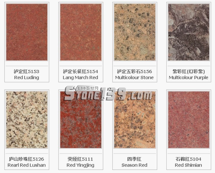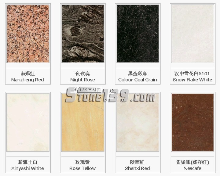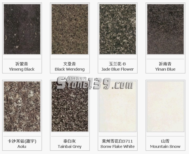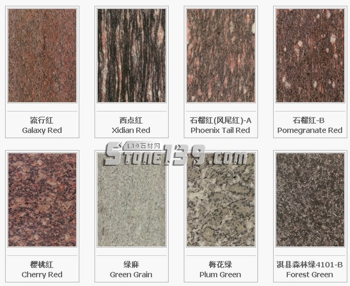 山西地區:北岳黑G1401;代縣金夢G1407;蝶彩綠G1409;翡翠藍B1411;富貴紅M1421;廣靈象牙黃 G1404;黑麻點 G1415;恒山青G1403;金沙黑-中點G1417;靈丘山杏花G1406;隨州綠G1410;夜玫瑰G1412;玉鉆麻G1408;