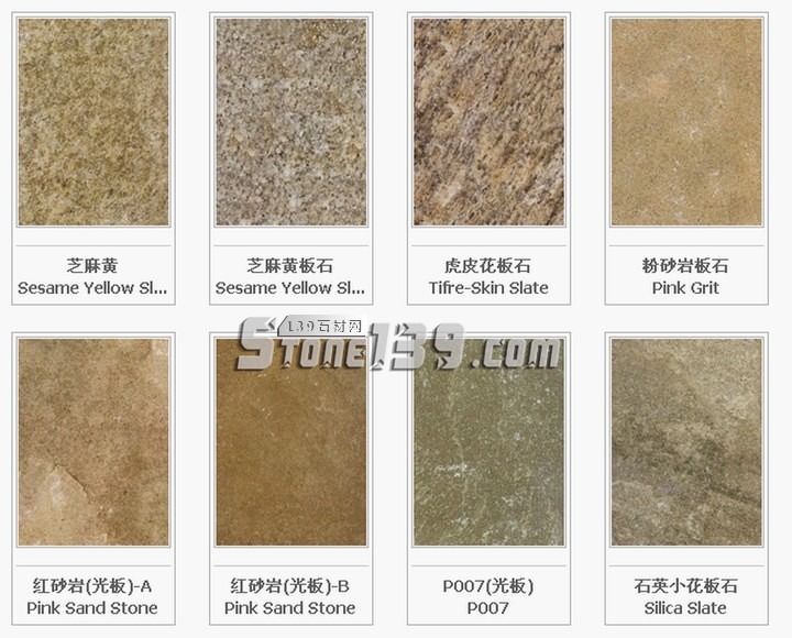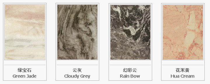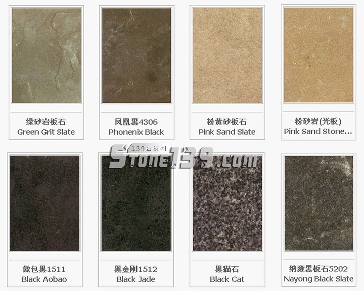 貴州地區:畢節殘雪M5262;畢節晶墨玉M5261;貴定紅M5241;貴陽水桃紅M5202;貴州金絲米黃M5233;貴州木紋米黃M5231;貴州平花米黃M5232;靈丘太白青G1405;納雍黑板石S5212;