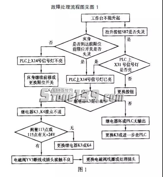 該機常見故障有:工作臺不能升起、不能左右旋轉,切割過程中床身跑偏、鋸片進給失控、床身移動有異響或卡住等??捎昧鞒虉D分析及排除故障。