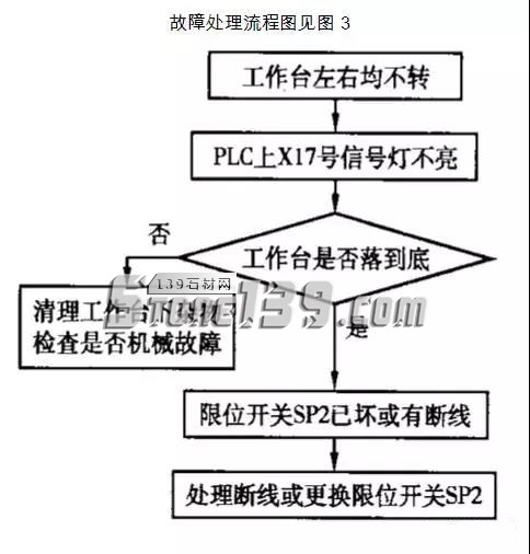 值得說明的是:如果SP2已壞或斷線,雖然工作臺已落到底,但PLC未接到信號,即PLC上信號燈X17不亮,相當于工作臺未落到底。所以工作臺不能轉動,應重點檢查限位開關SP2。
