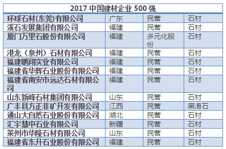 公布的名單中共有環(huán)球、溪石、萬里石等13家石材企業(yè)入圍“2017中國(guó)建材企業(yè)500強(qiáng)”,深圳康利工藝石材有限公司入圍“2017 中國(guó)民營(yíng)建材企業(yè) 100 強(qiáng)”,廣東云浮石材產(chǎn)業(yè)集群和南安市石材產(chǎn)業(yè)集群入圍“2017中國(guó)建材園區(qū)20強(qiáng)”。