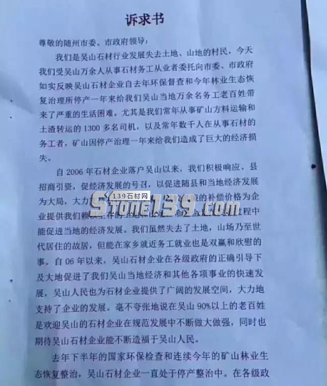湖北隨縣吳山全體石材務工人員的訴求書...