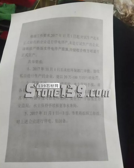 2、環(huán)保手續(xù)、安全生產手續(xù)、水土保護手續(xù),請各石材企業(yè)抓緊時間到對應的部門進行備案或審批。其中,環(huán)保手續(xù)可報至環(huán)保所;安全生產手續(xù)報至市安監(jiān)局;水土保持手續(xù)報至市水務局。