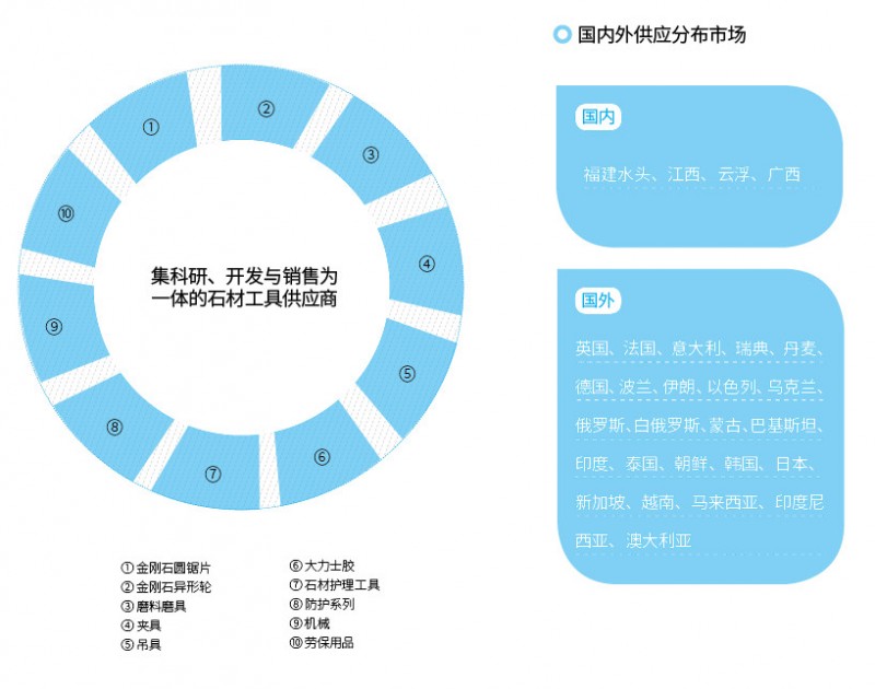 如此一來,百信石材工具的員工也出現了增幅。從最初的幾人到目前已有三十余位的公司團隊,分別設有外貿部、銷售部、生產部等部門。除此之外,百信石材工具的產品也在不斷完善,不僅停留在純粹的鋸片與磨料銷售,經過 20 年的沉淀,百信現已發展成石材工具一條龍服務的供應商,產品涵蓋金剛石圓鋸片、金剛石異形輪、磨料磨具、夾具、吊具、大力士膠、石材護理工具、防護系列、機械等。