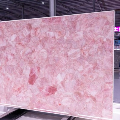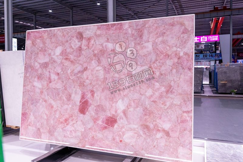粉水晶奢石的板面呈現出大面積的粉晶質感,整體以柔和的粉色系為主,色澤從淺粉到深粉漸變,如同將天然粉水晶晶體精心拼接而成,板面光澤度高,拋光后具有玻璃般的通透感,在光線照射下還能呈現出溫潤的透光效果,質感奢華且富有層次。 其紋路是由大小不一、形狀不規則的粉水晶晶體自然交織而成,晶體間的紋理如同天然的脈絡,沒有固定的走向,呈現出隨性而又和諧的分布狀態,部分區域還會夾雜著些許白色或淺粉色的晶體紋理,如同藝術大師的即興創作,每一塊板面的紋路都是獨一無二的,充滿了自然的藝術感。