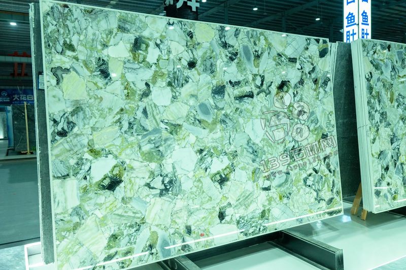 冷翡翠奢石的紋理極具自然藝術感:以深淺不一的綠色系為基底,融合了灰、白、黑等色彩,形成豐富的視覺層次。紋理由大小各異、形狀不規則的晶體碎片交織而成,這些晶體如同被精心拼接的翡翠碎塊,相互纏繞、交錯,呈現出隨性卻和諧的亂紋效果。其中,綠色的晶體或淺或深,淺綠如春日新葉,深綠似濃蔭翠色,還夾雜著黑色的紋理斑點,如同墨色在玉石上暈染,整體紋理無固定走向,每一處都像是天然的藝術創作,充滿了野性與奢華的質感,仿佛將一片翡翠森林的斑斕與深邃濃縮于石材之中。