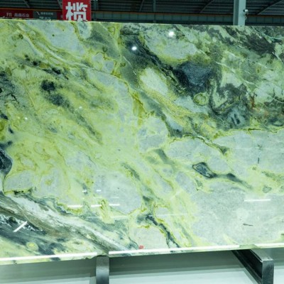 綠野仙蹤奢石的紋理極具自然奇幻感:以黃綠、灰綠為主色調(diào),交織著深灰、墨黑的色塊,形成豐富的色彩層次。紋理呈現(xiàn)出類似 “水墨暈染 + 礦物晶體交織” 的效果,無固定走向,如云霧在林間流動、溪流在石間穿梭,隨性卻和諧。淺綠如春日新葉,深綠似濃蔭翠色,墨黑斑塊如山石肌理,色塊過渡自然,仿佛將 “綠野仙蹤” 的奇幻森林場景凝固于板面,每一處紋理都是天然的藝術創(chuàng)作,充滿野性與雅致的融合感,視覺層次極為豐富且富有沖擊力。