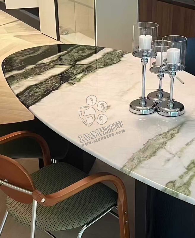 色彩紋理:基底呈深邃的翡翠綠色,交織著白色、灰色甚至黑色的自然紋理,紋理如山水流動(dòng)或?qū)毷忻姘愀挥兴囆g(shù)感,每一塊石材的紋理都獨(dú)一無二,具有極高的天然美學(xué)價(jià)值。