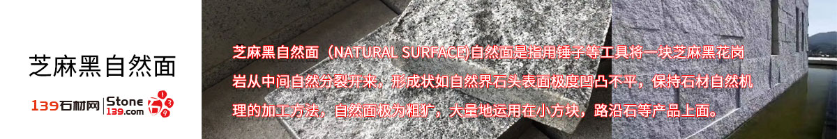 芝麻黑自然面(natural surface)自然面是指用錘子等工具將一塊芝麻黑花崗巖從中間自然分裂開來,形成狀如自然界石頭表面極度凹凸不平,保持石材自然機理的加工方法,自然面極為粗獷,大量地運用在小方塊,路沿石等產品上面。這種表面處理通常是用手工切割或在礦山鏨以露出石頭自然的開裂面。